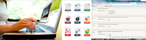 Nastavni sadržaji mogu imati različite multimedijalne formate: tekstove, slike, tabele, prezentacije, video i audio klipove, elektronska testiranja.